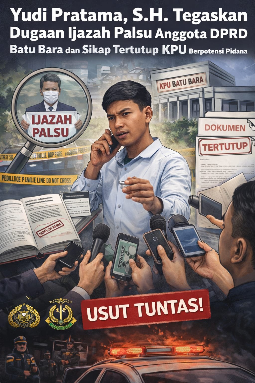 Batu Bara – Isu serius mengguncang Kabupaten Batu Bara setelah praktisi hukum Yudi Pratama, S.H., secara terbuka menyoroti dugaan penggunaan ijazah palsu oleh anggota DPRD Batu Bara sekaligus menyoroti sikap tertutup Komisi Pemilihan Umum (KPU) setempat dalam menyikapi transparansi informasi publik.